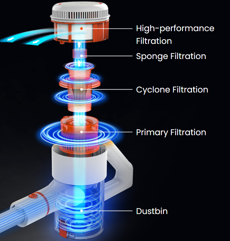 “Cyclone”technology is a well-known technology that used in filtration, it ensures larger particles dust and smaller particles separate from each other. Larger particles dust will go down to the bottom of the dust cup, the smaller particles will move up to the next stage.