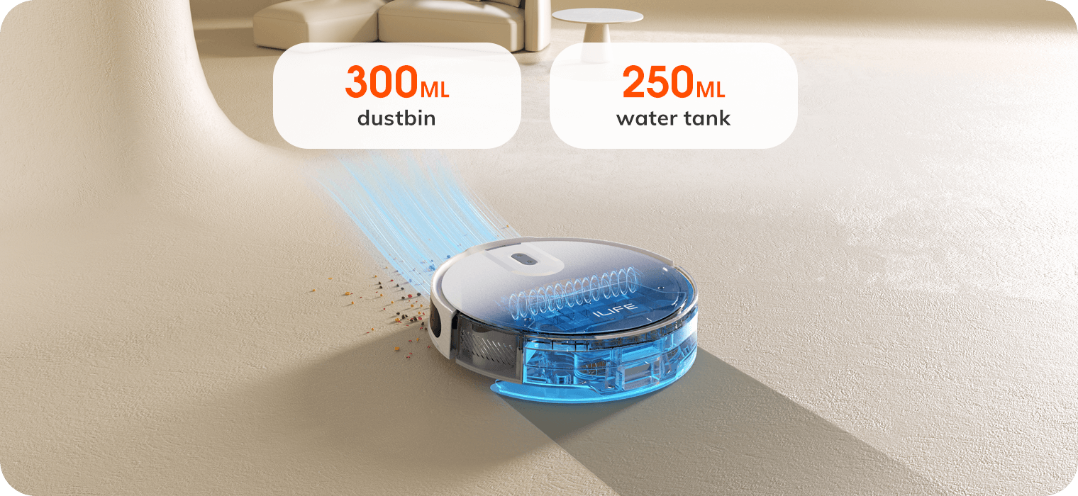 Depósito de 300 ml (polvo) + 250 ml (agua) para limpieza integral.
